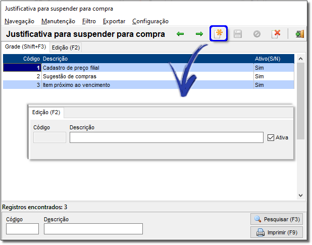 Para cadastrar basta ir ao menu Cadastros > Produtos > Itens Suspensos para Compra > Justificativa para Suspender para Compra.