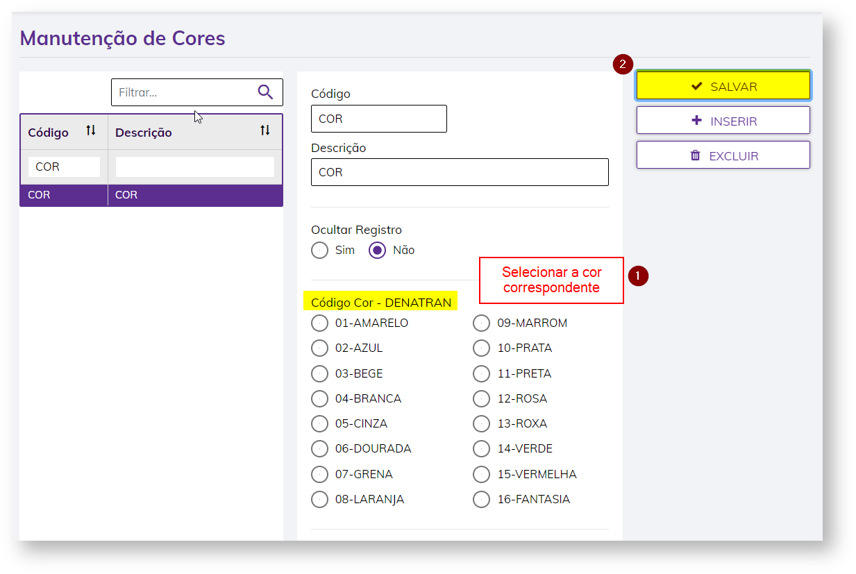 2) Acessar o cadastro da cor, através do menu Veículos > Cadastros > Cores e na manutenção da Cor, informar qual o vínculo com o campo Código Cor - Denatran