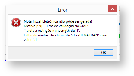 Motivo [99] - [Erro de validação do XML: '' viola a restrição minLength de '1'. Falha da análise do elemento 'cCorDENATRAN' com valor ''