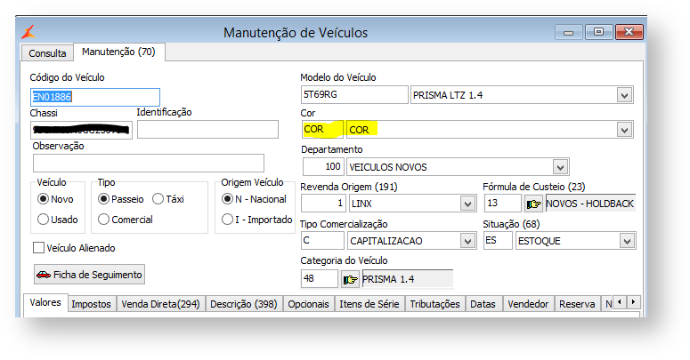1) Acessar o cadastro do veículo, através do menu Veiculos > Cadastros > Veículos e localizar qual o código da cor vinculada ao veículo: