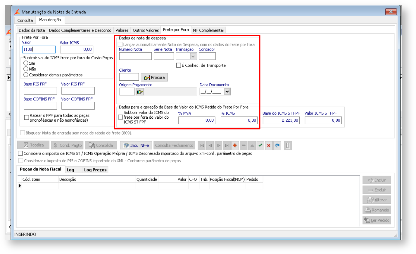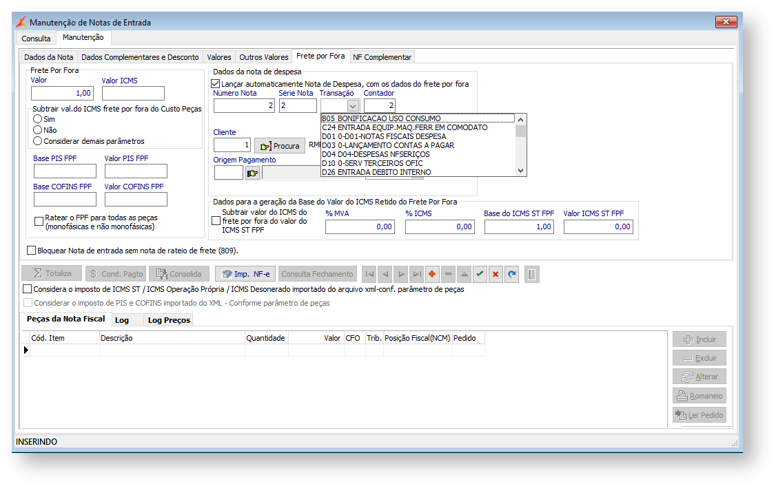 A flag nesta aba é utilizada para lançar uma nota de despesa, além de permitir a inclusão de um valor de frete por fora. Ao utilizar este processo, o sistema gerará a nota com os dados fornecidos, como número da nota fiscal, série, transação, contador e cliente. Observe que, sem o menu de Notas Fiscais de Despesas habilitado, o campo permanecerá desabilitado.