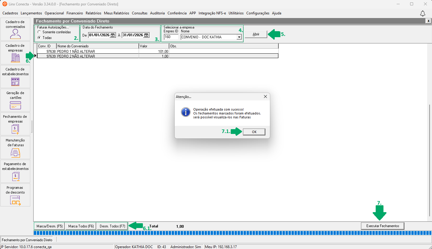 7.1. Será exibida a mensagem 'Atenção...Operação efetuada com sucesso! Os fechamentos marcados foram efetuados, será possível visualiza-los nas faturas.'. Clique em 'OK'.