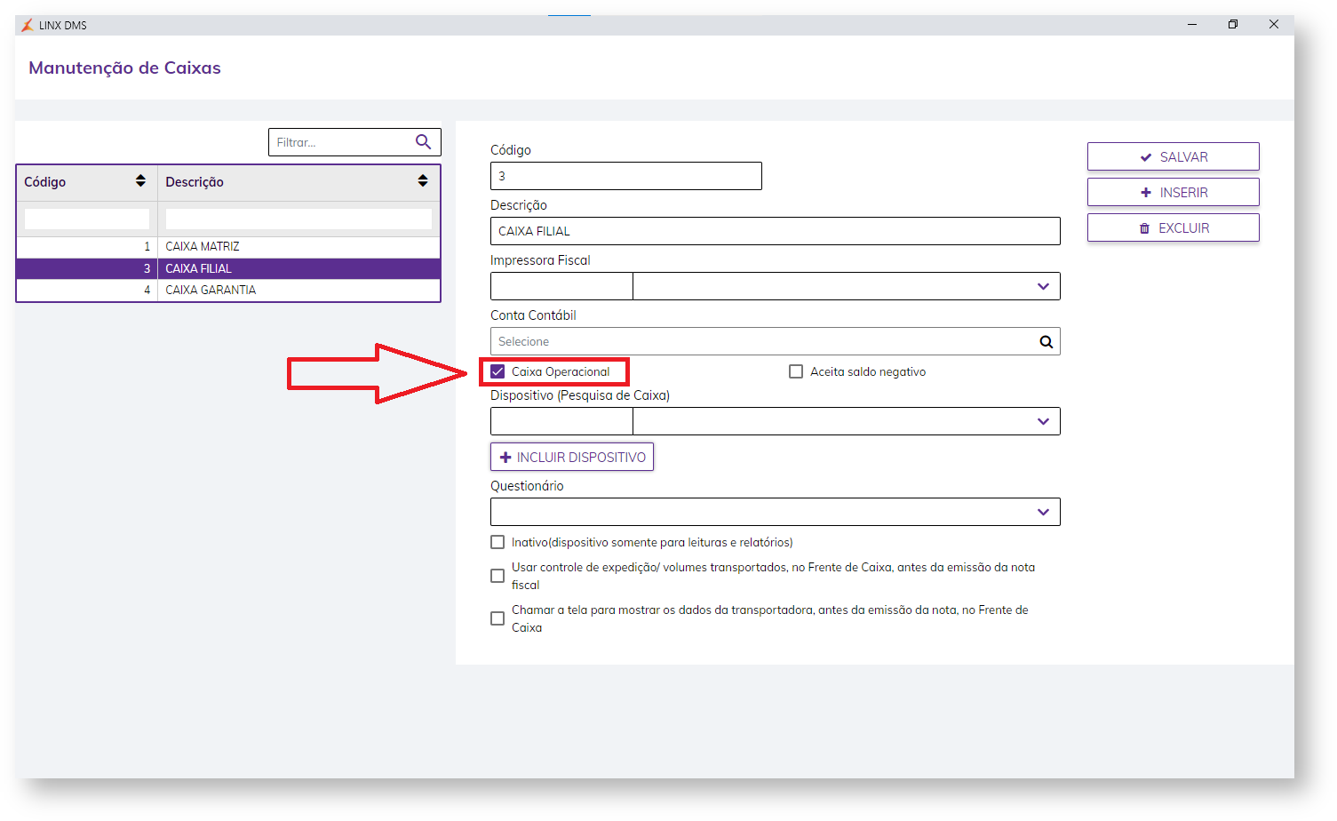 No caso de um caixa operacional, o campo ficará desabilitado, conforme a imagem abaixo: