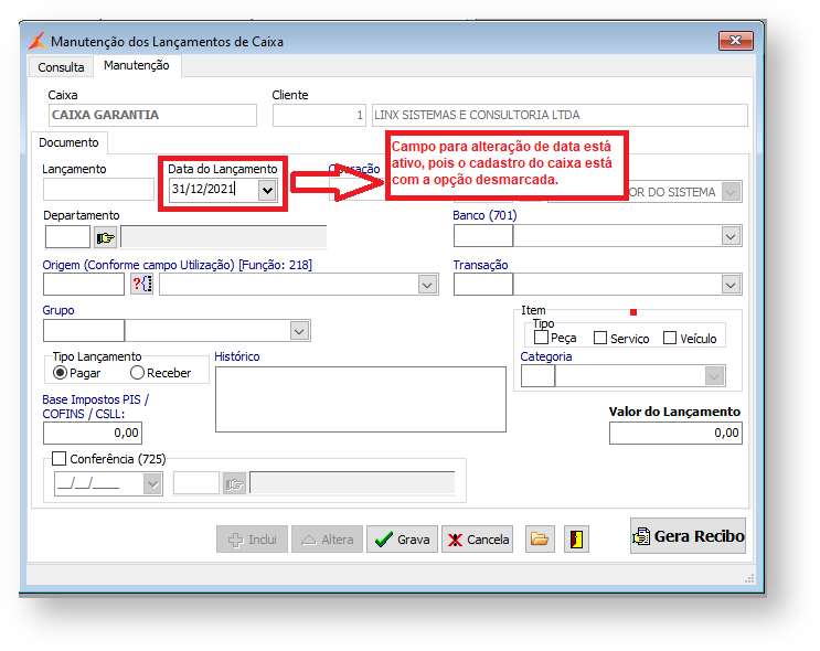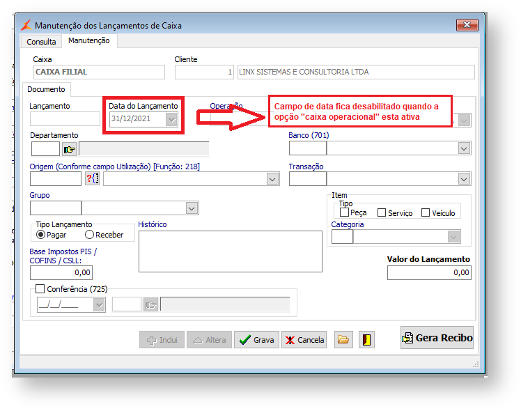 Sendo assim, caso seja necessário fazer um lançamento com data retroativa podemos mudar o cadastro do caixa (desmarcando a opção "Caixa Operacional"), fazemos o lançamento e depois retornamos à opção original.