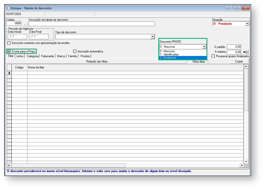 3. Irá habilitar o campo Desconto Propz para selecionar as opções de: