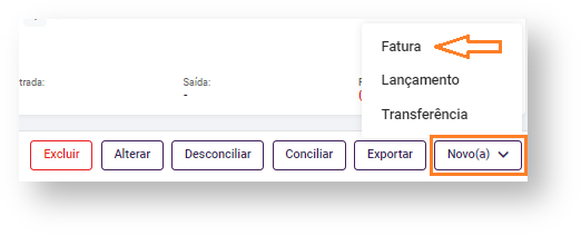 - Novo(a): Clicando neste botão poderá realizar o lançamento manual de faturas a receber ou a pagar, lançamento contábil ou transferências.