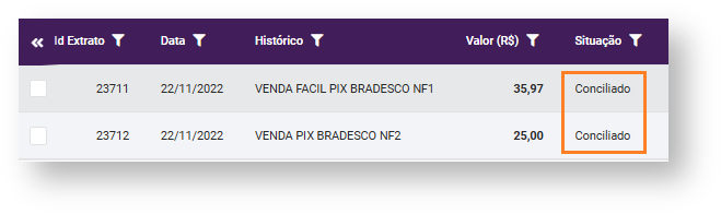 - Campos informativos:- Conciliado: Será exibido o percentual de dados do extrato bancário que estão com a situação "Conciliado".