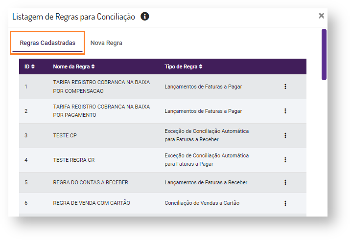 - Regras específicas para a conciliação de pagamentos com cartões: Para mais informações, confira o tópico "Conciliação de Faturas de Cartão" neste mesmo manual.