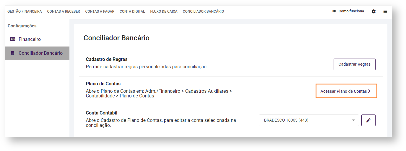 A criação da conta bancária no plano de contas pode ser feita através da configurações do Conciliador Bancário acessando Menu > Adm./Financeiro > Gestão Financeira > aba "Configurações" > sub-aba "Conciliador Bancário".