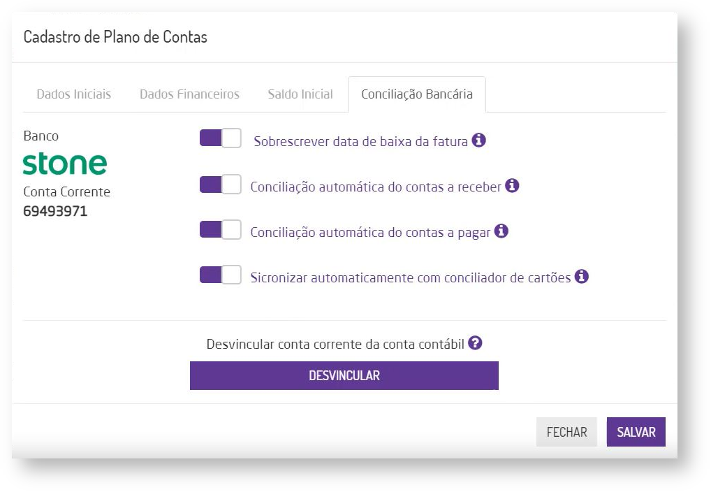 Além disso, para a conciliação automática é indispensável que a conta bancária esteja previamente cadastrada no Plano de Contas. Ou seja, quando a configuração do Plano de Contas está ativada, o sistema faz a conciliação automaticamente, vinculando os valores de contas a receber e contas a pagar de forma automática, sem necessidade de intervenção manual.