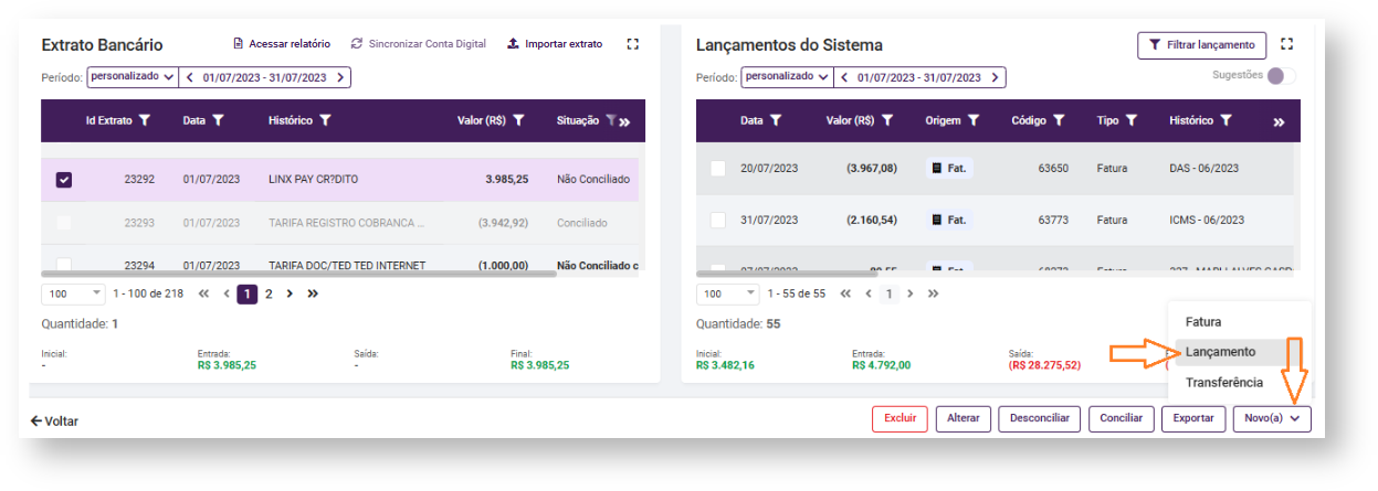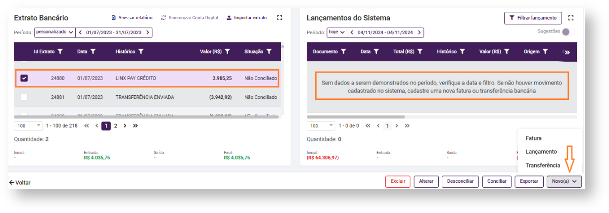 Tela de Conciliação: grupo "Lançamentos do Sistema"