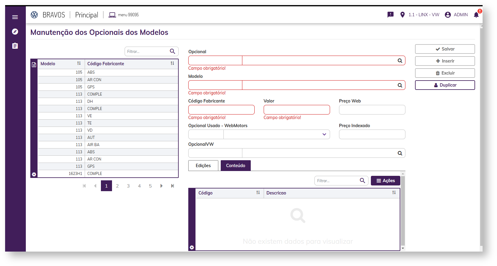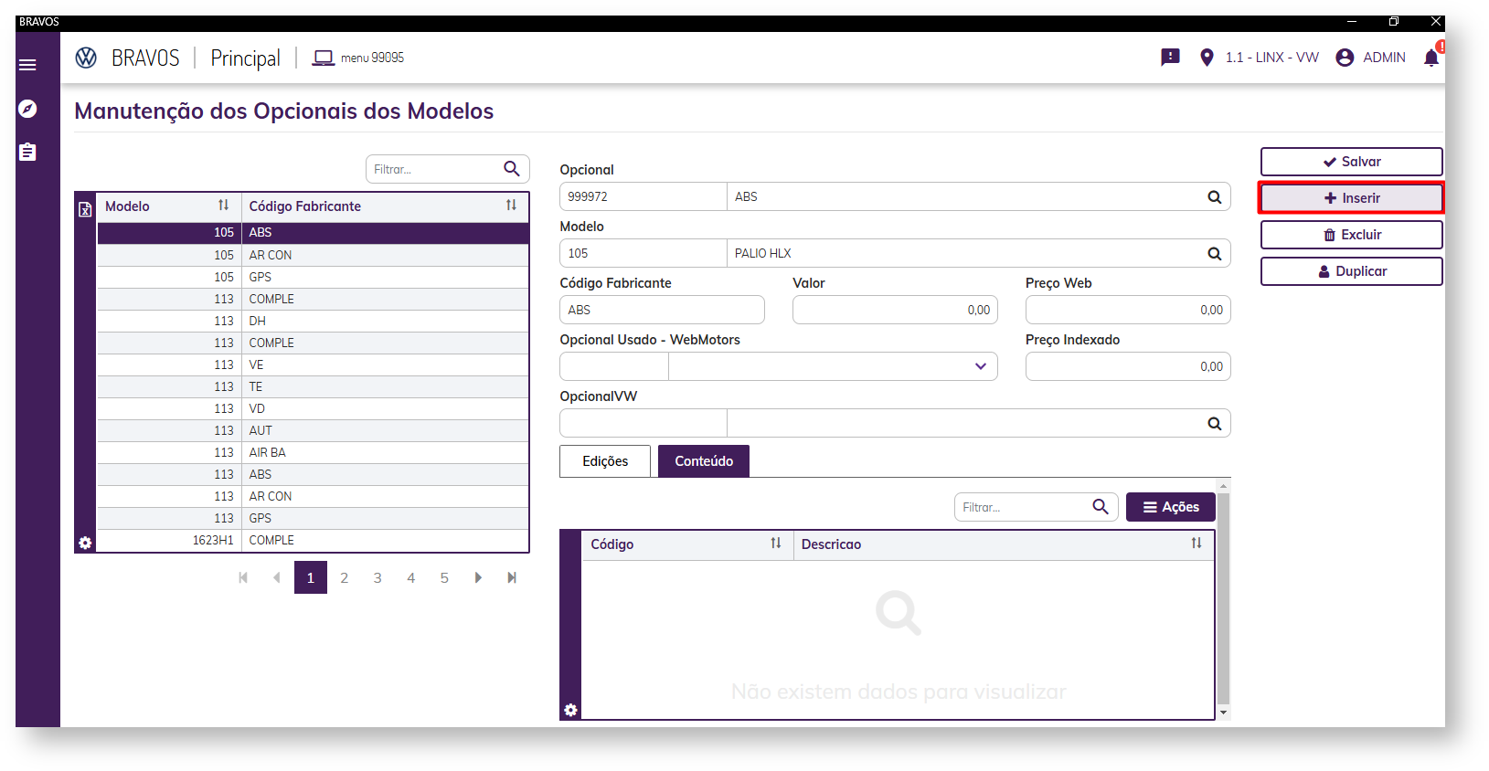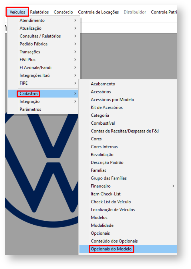 1) Acesse o menu (99095) Veículos > Cadastros > Opcionais do Modelo