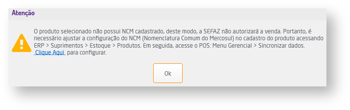 - Caso o item incluso na venda não tenha o NCM cadastrado, então o sistema irá exibir um alerta e o cadastro poderá ser feito clicando sobre o link "Clique Aqui".