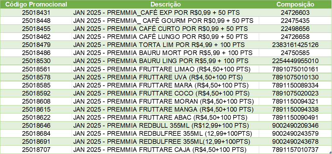 Tabela de Códigos Promocional Premmia - Promoções Jan/Fev