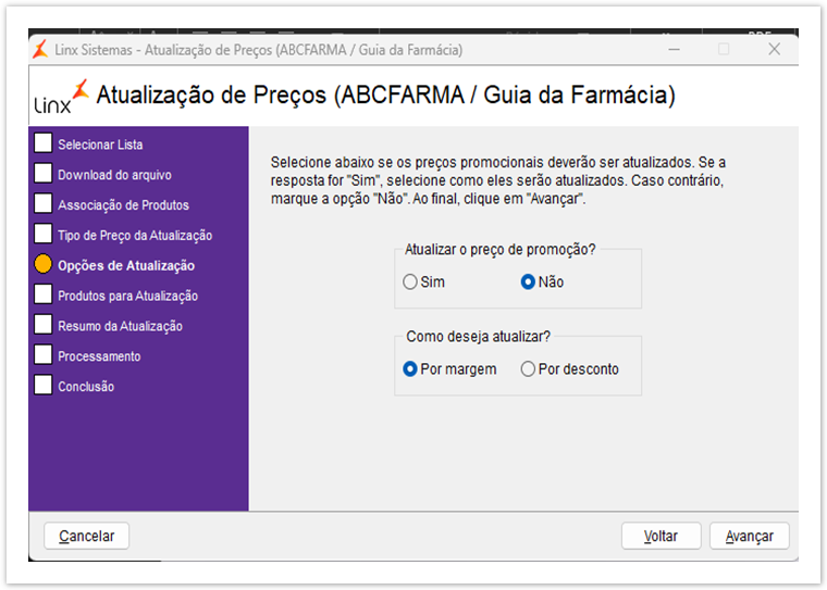 A partir da versão 3.32.0.0 foi implementada a coluna Percentual de ICMS para que seja mais fácil diferenciar as alíquotas normais das alíquotas ALC (Área de Livre Comércio) na tela de Produtos para alteração de preço. Antes de realizar a atualização de preço Guia da Farmácia, verifique a alíquota de ICMS através do artigo Como Definir Alíquota de ICMS para a Filial Abra o Linx Big Farma e vá até o menu Utilitários > Atualizar... > Atualização de preços e escolha a opção Atualizar preços e clique no botão . Figura 01 - Atualizador de Preços Selecione a opção Guia da Farmácia e clique novamente em . Figura 02 - Atualização Guia da Farmácia Depois de selecionar o tipo de lista Guia da Farmácia, informe o CNPJ e a senha de acesso. Figura 03 - Informar Dados Os dados de acesso são obtidos através do cadastro na própria ABCFarma. Figura 04 - Atualização Nessa tela é possível verificar a quantidade dos produtos constantes na lista escolhida (ABCFarma ou Guia da Farmácia) e também a quantidade de produtos associados com a base de dados do cliente. Figura 05 - Produtos Associados Caso seja necessário é possível consultar (visualizar) os produtos associados ou então associar manualmente os produtos que ainda não foram associados. Para isso basta clicar no botão . Figura 06 - Visualizar/Associar Produtos A tela virá como padrão sem informações, e pode ser utilizado filtro para visualização. Terminado o processo de associação clique no botão ou pela tecla de atalho ESC. Selecione o botão para ir ao próximo passo. Defina onde serão aplicadas as alterações dos preços, se no cadastro de produtos apenas, se apenas nos preços filiais ou em ambos os registros do produto. Neste passo será necessário definir as opções de atualização. Figura 08 - Opções de Atualização Na opção de atualizar preço promoção deve-se levar em consideração que ao escolher SIM os preços promocionais serão alterados e assim deverão ser consideradas a troca das etiquetas desses produtos alterados, bem como como esses produtos serão alterados, se por margem ou por desconto. Se escolher a opção Não, não será necessário marcar nenhuma das opções na seção "Como deseja atualizar?", pois o sistema ignorará essa configuração, ou seja, não será atualizado o preço de promoção. → Será realizado a atualização do preço de promoção com base na Margem de promoção atual. Neste caso o valor da Margem de promoção será mantido e os valores de Preço de Promoção e Desconto de promoção serão atualizados. Exemplo de Cálculo por Margem Preço de Promoção = Preco de Compra * (1 + (Margem de Promocao / 100)) Desconto Promoção = (1 - (Preco de Promocao / Preco de Venda)) * 100 → Será realizado a atualização do preço de promoção com base no Desconto de promoção atual. Neste caso o valor do desconto de promoção será mantido e os valores de Preço de Promoção e Margegm de promoção serão atualizados. Exemplo de Cálculo por Desconto Preço de Promoção = Preco de Venda - (Preco de Venda * Percentual do Desconto Promocao / 100) Margem de Promoção = ((Preco de Promocao / Preco de Compra) - 1) * 100 Neste passo é possível selecionar os produtos que estão sujeitos a alteração de preço. Clique no botão . Figura 10 - Produtos para Alteração de Preço Selecione os produtos de acordo com o desejo ou necessidade. A partir da versão 3.32.0.0 foi implementada a coluna Percentual de ICMS para que seja mais fácil diferenciar as alíquotas normais das alíquotas ALC (Área de Livre Comércio). Para saber mais sobre o parâmetro para permitir atualizar preços do ABC Farma e Guia da Farmácia em área de livre comércio para filiais específicas, clique aqui! Após selecionar os produtos, retorne para a tela de atualização. Neste passo será repassado todas as escolhas feitas nos passos anteriores, apresentando um resumo do que será realizado a seguir. Figura 11 - Resumo da Atualização Caso seja necessário alterar qualquer informação apresentada até o momento basta clicar no botão . A partir desse passo a atualização será realizada dentro dos parâmetros informados nos passos anteriores, basta apenas aguardar o término do processo. Figura 10 - Atualização O processo foi concluído e os preços foram alterados.Atualização dos Preços