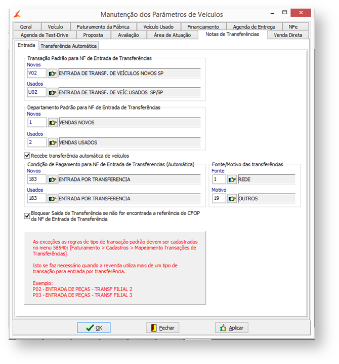 Atenção: Para as concessionárias que utilizam a transferência automática de veículos as referências de CFOP sempre serão validadas independentemente deste campo estiver marcado ou não.