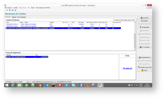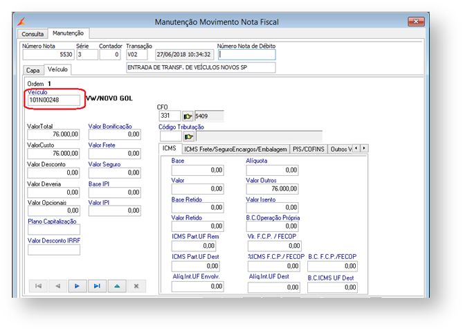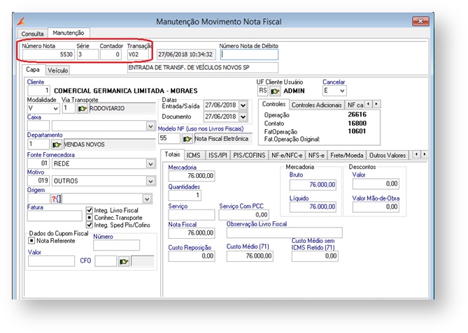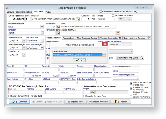 Neste momento a nota de entrada do veículo será efetivada e enviado ao <Frente de Caixa> uma nota de transferência para a filial destino.