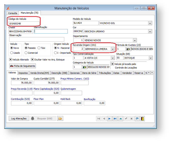Execute [Linx DMS > Veículos > Cadastros > Veículo] e verifique que o veículo já está localizado na revenda de destino e liberado para comercialização: