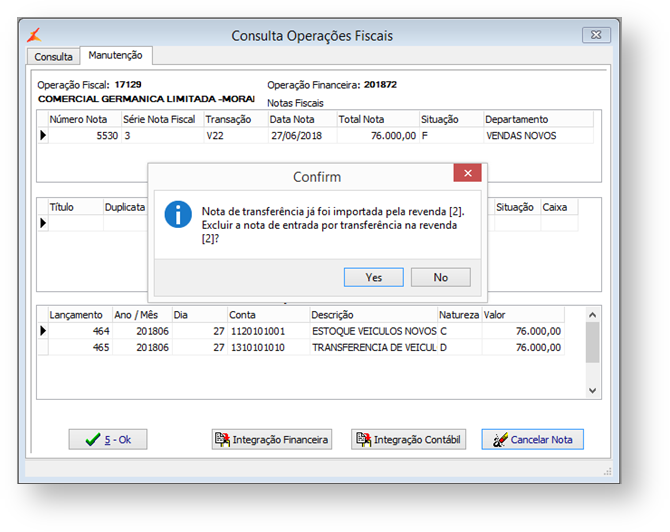 Se o usuário responder “Yes”, o sistema irá excluir a nota de entrada na revenda de destino, cancelar a nota de saída na revenda de origem e posicionar o veículo novamente na revenda de origem.