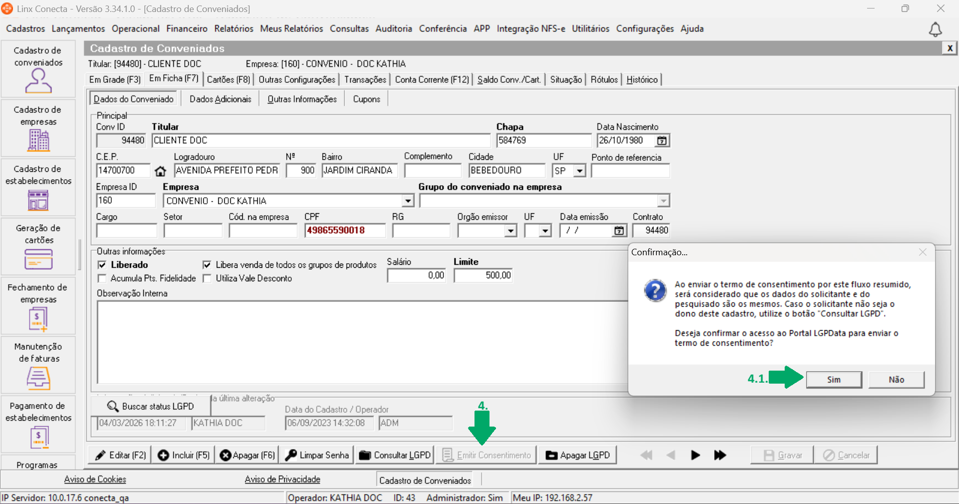 4.1. Será exibida a mensagem 'Confirmação...Ao enviar o termo de consentimento por este fluxo resumido, será considerado que os dados do solicitante e do pesquisado são os mesmos. Caso o solicitante não seja o dono deste cadastro, utilize o botão "Consultar LGPD'. Deseja confirmar o acesso ao Portal LGPData para enviar o termo de consentimento?'. Clique em 'Sim' para confirmar;