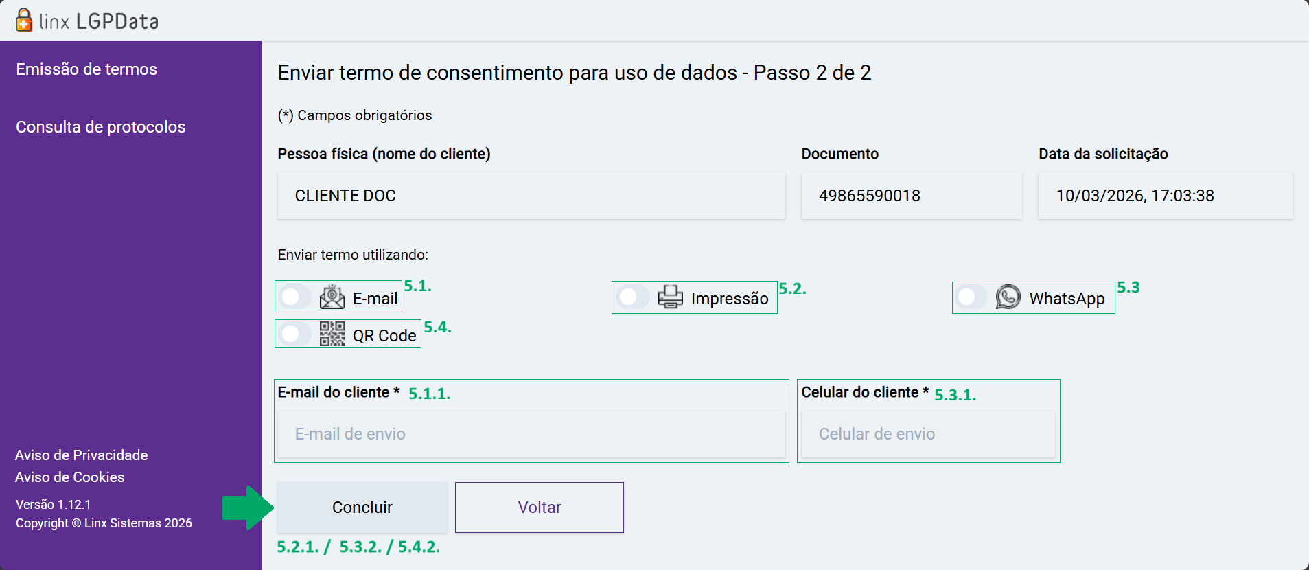 Importante: para maiores informações sobre o processo de cada tipo de envio de termo de consentimento, verifique o artigo: Portal LGPData - Emissão de termos - Como emitir o termo de consentimento.