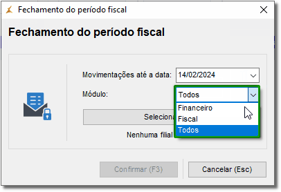 O fechamento do período fiscal encontra-se no menu Fiscal > Fechamento do Período Fiscal.