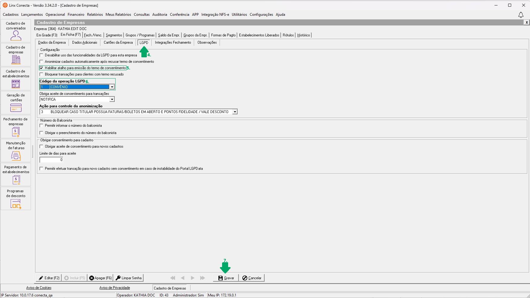 Atenção: para usuários comuns da rede, essa opção de habilitar ou desabilitar o atalho para emissão do termo de consentimento é permitida apenas para empresas com código de operação '1 Convênio' e '2 Fidelidade da Rede'. Para empresas com código de operação '3 Fidelidade Febrafar', somente usuários Febrafar podem fazer a alteração. Ao marcar a opção 'Habilitar atalho para emissão do termo de consentimento' será habilitado para todos os módulos que usam LGPD. No 'Portal LGPData', poderá ter vários termos cadastrados e esse código de operação permite que seja feita a associação de qual termo deve ser emitido para o cliente. Essa configuração é obrigatória para as redes e empresas que usam a LGPD.