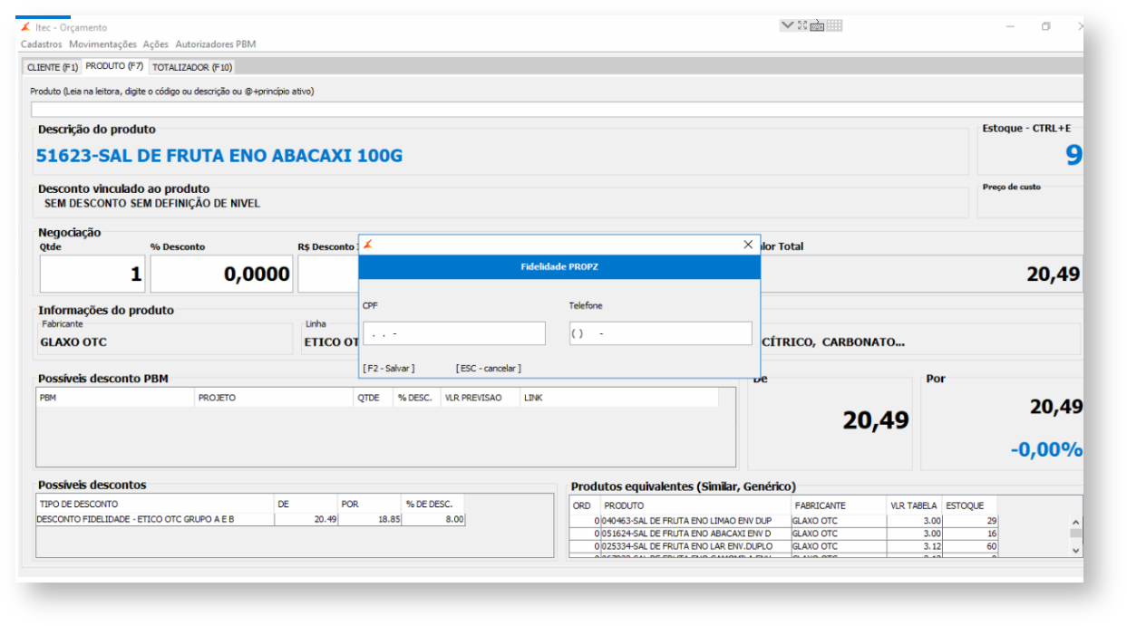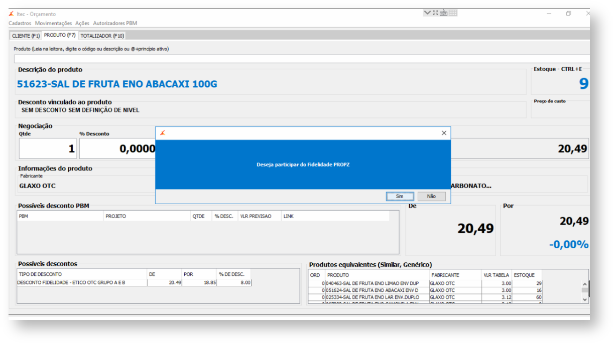 2. Ao inserir um produto pertencente a uma tabela de descontos identificada como "Enviar para a Propz", será gerado uma mensagem de "Deseja participar do Fidelidade Propz?".