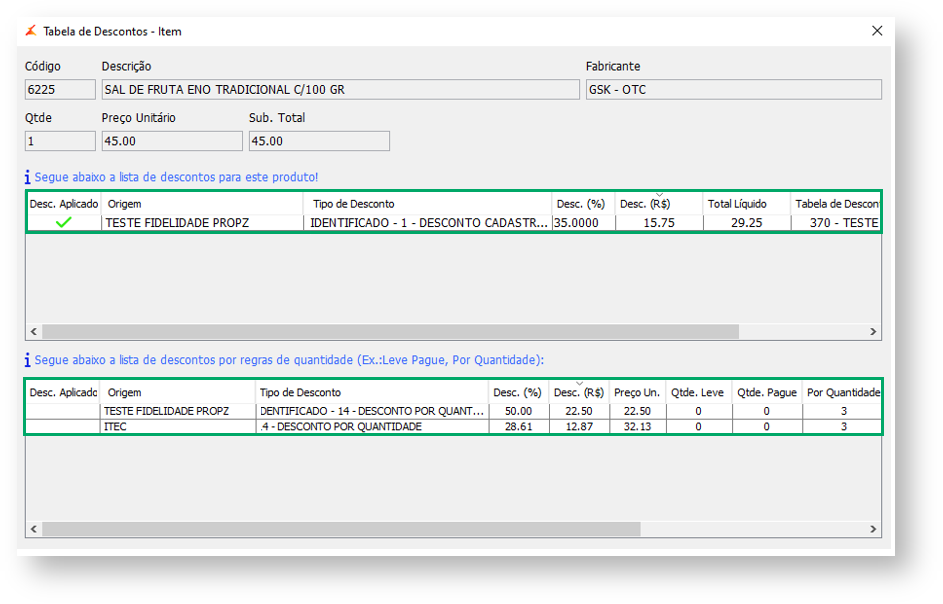 9. Clique em Exibir Descontos para abrir a Tabela de Descontos - Item onde é possível visualizar a lista de descontos para este produto ou a lista de descontos por regras de quantidade.
