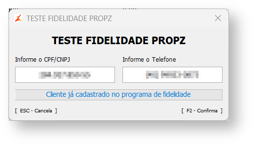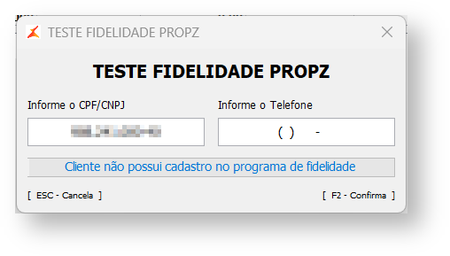 4. Na tela de Fidelidade Propz informe o CPF ou CNPJ do cliente.