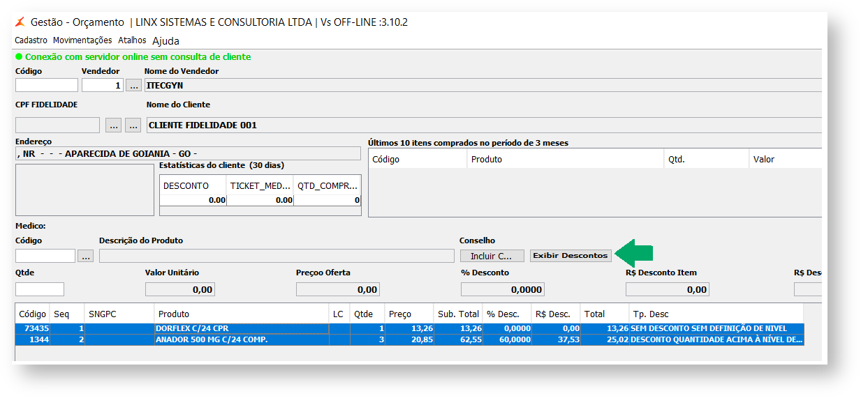 Quando configurado o campo de Exibir Desconto do Produto nas Configurações de filais como 1, 2 ou 3 será possível acionar/clicar sobre esse botão Exibir Descontos antes ou depois que o produto já foi inserido no carrinho, justamente para auxiliar o balconista na consulta rápida de preços.