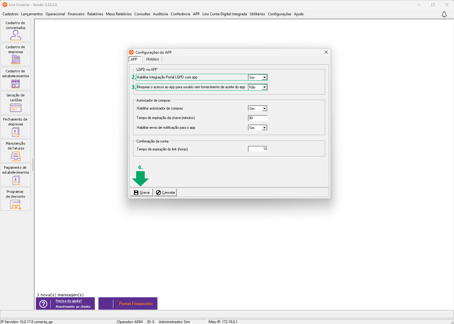 2. No campo 'Habilitar Integração Portal LGPD com app' selecione 'Sim' para habilitar a integração com os termos da 'Lei Geral de Proteção de Dados' ou 'Não para manter esta integração desabilitada no APP;