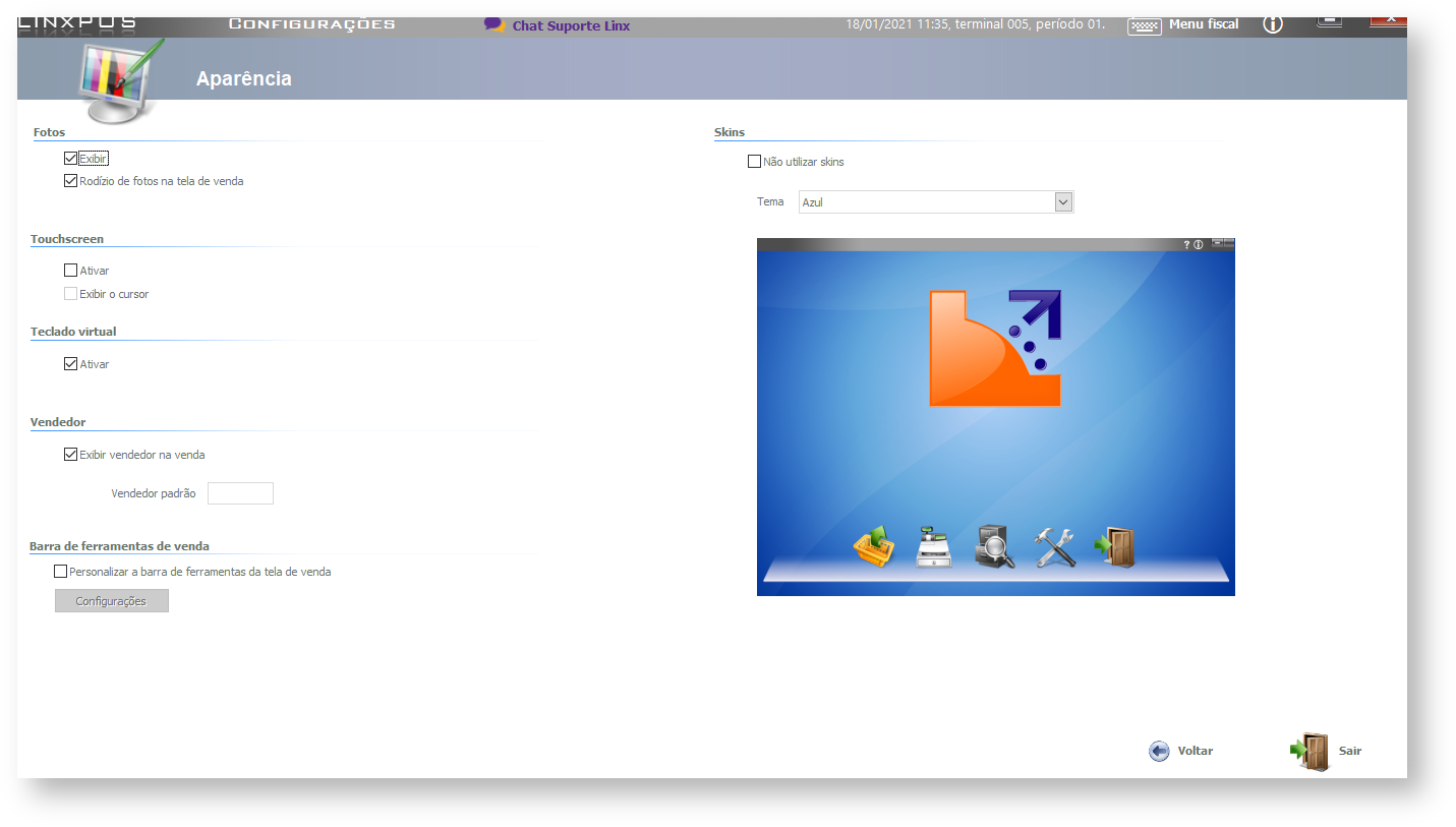 Skins | Tema: Quando selecionado um tema, permite definir a aparência, com novas cores para o ambiente de trabalho do Linx POS. Não exibir animação: Desabilita as animações que são executadas pelos botões de opções e palavras na área de trabalho do Linx POS. |