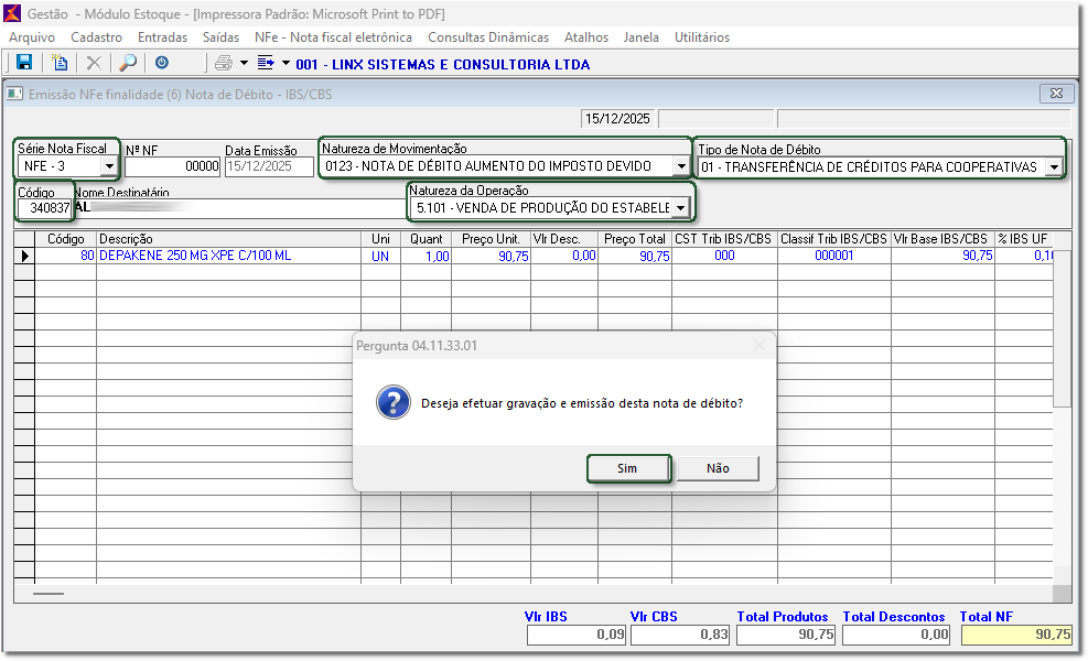10. Será apresentada a mensagem 'Deseja efetuar gravação e emissão desta nota de débito?', clique em 'Sim' para confirmar a gravação.