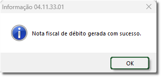 11. Será apresentada a mensagem 'Nota fiscal de débito gerada com sucesso', clique em 'OK' para fechar a mensagem;