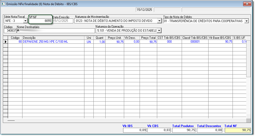 2. Ao abrir a tela 'Emissão NFe finalidade (6) Nota de Débito - IBS/CBS', pressione a tecla F2 para habilitar a tela;
