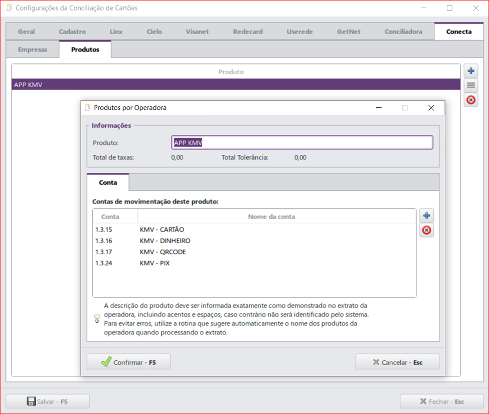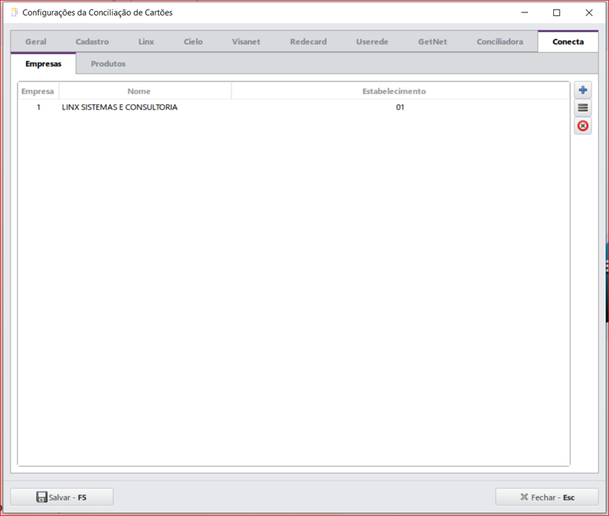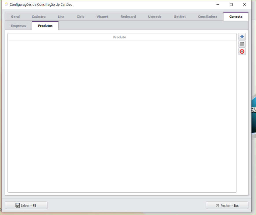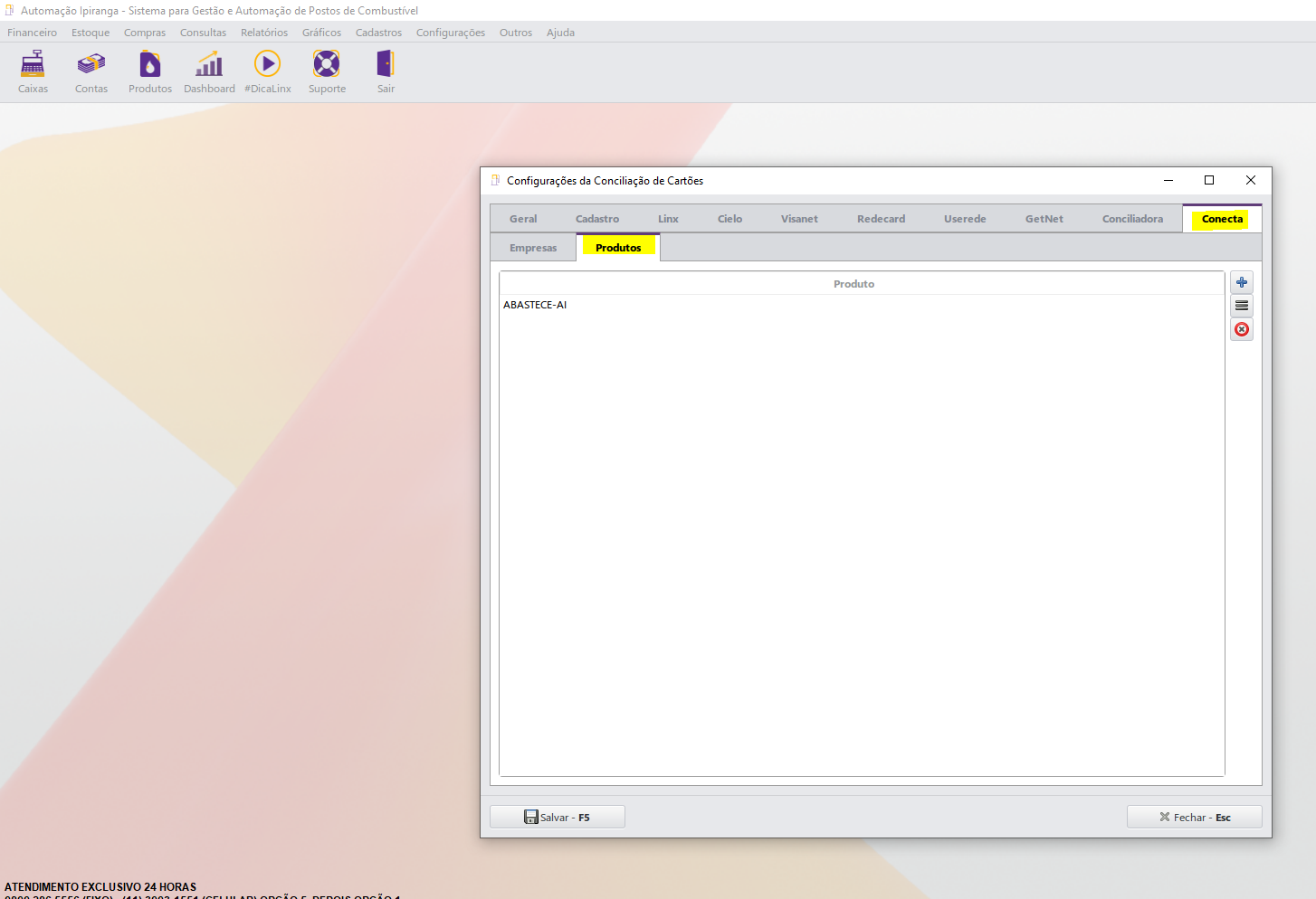 Para realizar as configurações das contas foi criada uma aba conecta em Configurações > Modulos > Conciliação de Cartões > Aba Conecta.