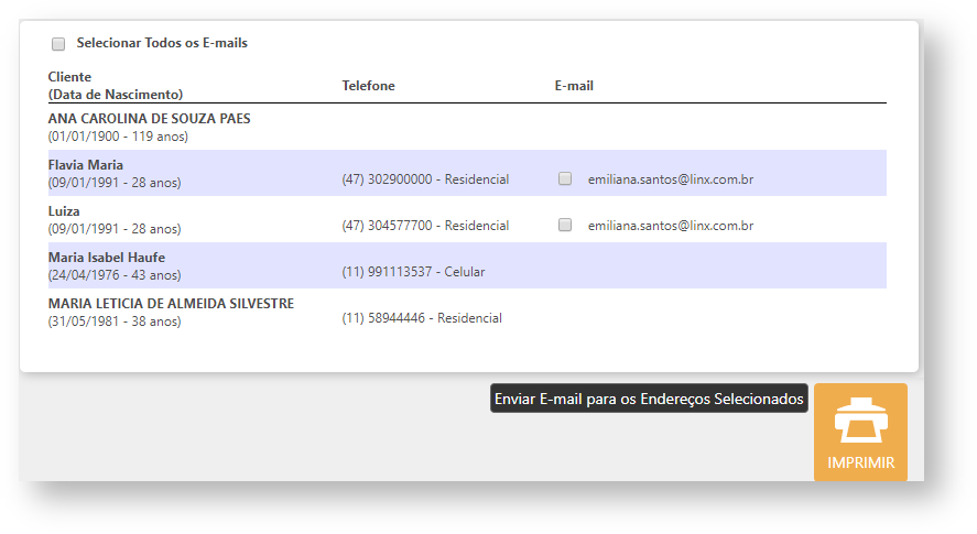 - Enviar E-mail para os Endereços Selecionados: através deste recurso é possível enviar um e-mail parabenizando o cliente e também enviado-lhe um vale, cupom ou desconto para o próximo tratamento. Através do botão "Selecionar Todos os E-mails" é possível marcar todos os endereços para o envio de uma única vez;