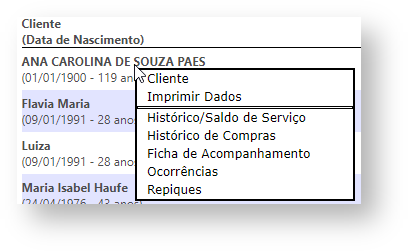 - Cliente (Data de Nascimento):será exibido o nome do cliente, sua data de nascimento e sua idade. Ao passar o cursor sobre o nome do cliente será exibido um menu de opções;