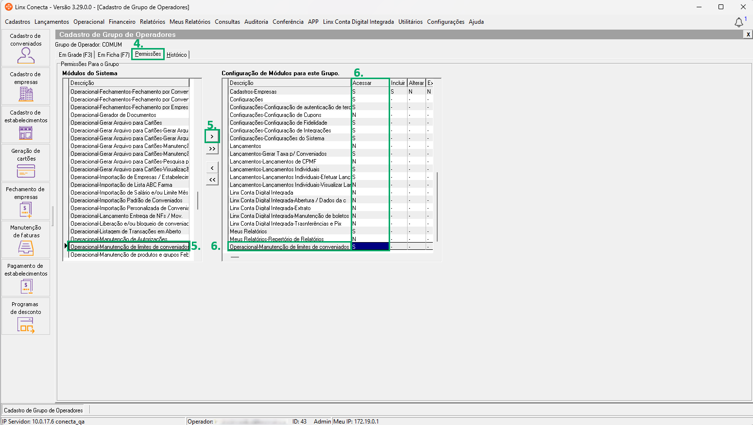 6. Logo ao lado em 'Configuração de Módulos para este Grupo', encontre a opção 'Operacional-Manutenção de limites de conveniados' e na coluna 'Acessar' altere de 'N' para 'S'.