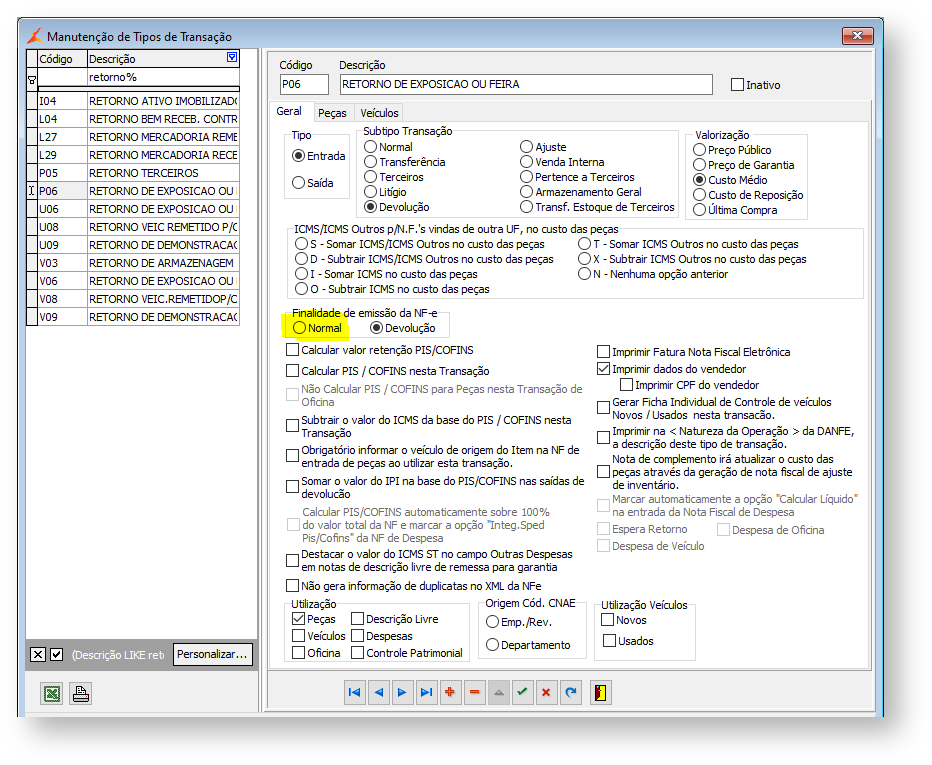 Essa parametrização afeta diretamente a Tag. <FinNFe> no XML da Nota Fiscal, onde "Normal = 1 e Devolução = 4", conforme abaixo:<ide><cUF>43</cUF><cNF>66842136</cNF><natOp>Venda de produção do estabelecimento</natOp><indPag>0</indPag><mod>55</mod><serie>110</serie><nNF>2030</nNF><dhEmi>2016-01-26T00:00:00-02:00</dhEmi><tpNF>1</tpNF><idDest>1</idDest><cMunFG>4314902</cMunFG><tpImp>1</tpImp><tpEmis>1</tpEmis><cDV>4</cDV><tpAmb>2</tpAmb><finNFe>4</finNFe><indFinal>0</indFinal><indPres>9</indPres><procEmi>0</procEmi><verProc>OOBJ-NFE_EE</verProc><NFref><refNFe>43151099999999000191551100000009321668421307</refNFe></NFref>