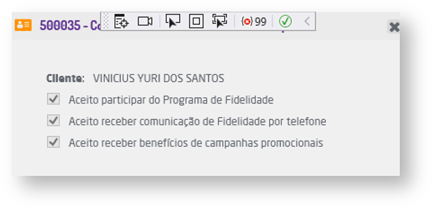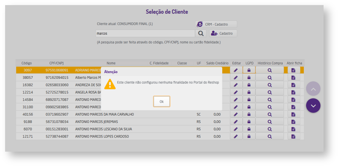 Ao selecionar um cliente, na coluna "LGPD", ao clicar no ícone cadeado o sistema exibirá as configuração de aceites de finalidades feitos no portal do Reshop LGPD para o cliente em questão.