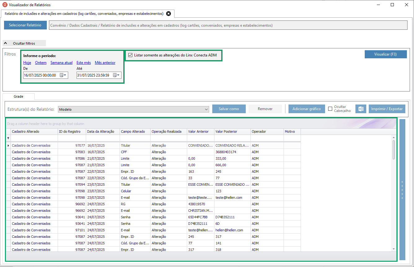 4. Clique em 'Visualizar (F3)', irá listar no relatório somente as alterações que ocorrem no Linx Conecta Adm.
