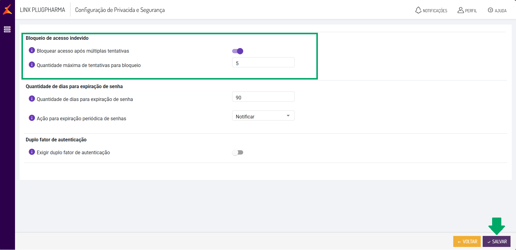 4. No campo 'Quantidade máxima de tentativas para bloqueio', informe o número máximo de tentativas (de 1 até 10) antes que o sistema efetue o bloqueio;