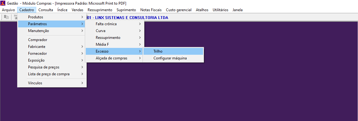 Para realizar este processo acesse: Gestão > Compras > Cadastro > Parâmetro > Excesso > Trilho.