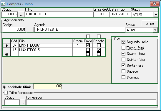 - No campo "Quantidade Filias" é possível visualizar quantas filiais foram vinculadas àquele trilho;
