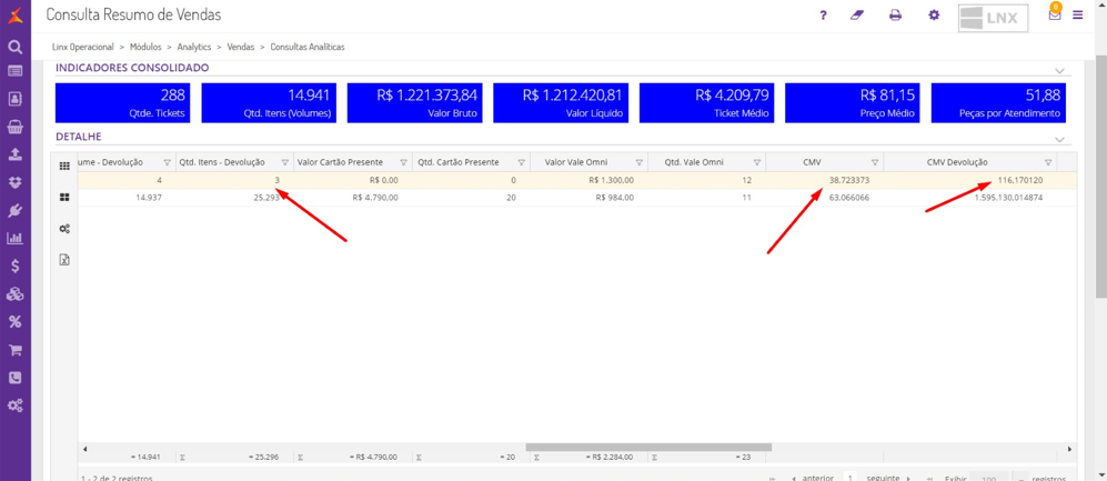 | Nova coluna CMV — Devolução Tela Consulta de Resumo de Vendas | Implementação na tela Consulta de Resumo de Vendas. Por meio desta tratativa, foi adicionada a coluna CMV - Devolução para obter o valor (Qtde - Qtde Devolução) * CMV). Local: Tela Consulta de Resumo de Vendas Linx Operacional > Módulos > Analytics > Vendas > Consultas Analíticas