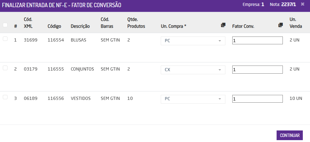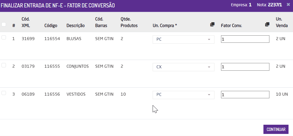 - Caso o parâmetro Aplicar a todos os itens esteja habilitado, a tela de fator de conversão sempre será exibida, permitindo alterar o fator de conversão de todos s itens da nota.