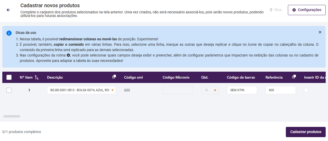 Após informar todos os campos dos produtos, clique em Finalizar, o sistema irá realizar um novo cadastro ou associar os produtos a produtos já existentes no sistema.