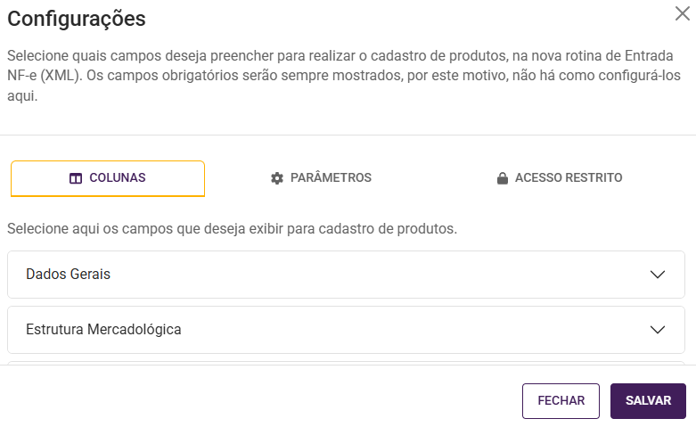 Ao acessar a tela de cadastro de produtos na Entrada XML, você poderá acessar as configurações que impactarão as informações a serem preenchidas no cadastro de cada produto. Nesta tela você poderá definir as colunas que serão exibidas no cadastro e também alguns parâmetros.